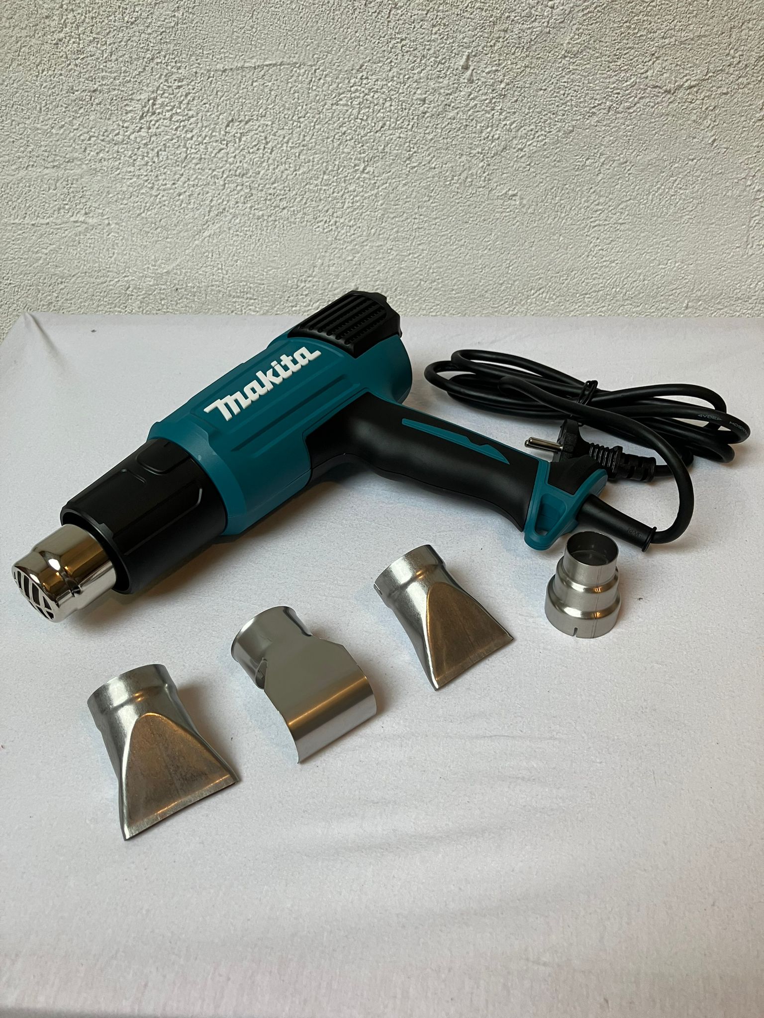 Makita Heteluchtpistool: Een krachtige 230V machine met een variabel temperatuurbereik van 50°C tot 600°C, geleverd inclusief diverse opzetstukken.